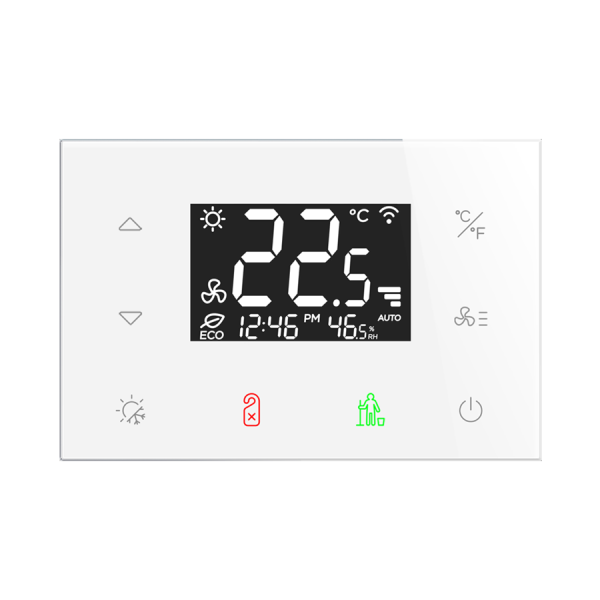 - Sklenený dotykový termostat pre fancoily RFTC-3/W, biely (voliteľné ikony)